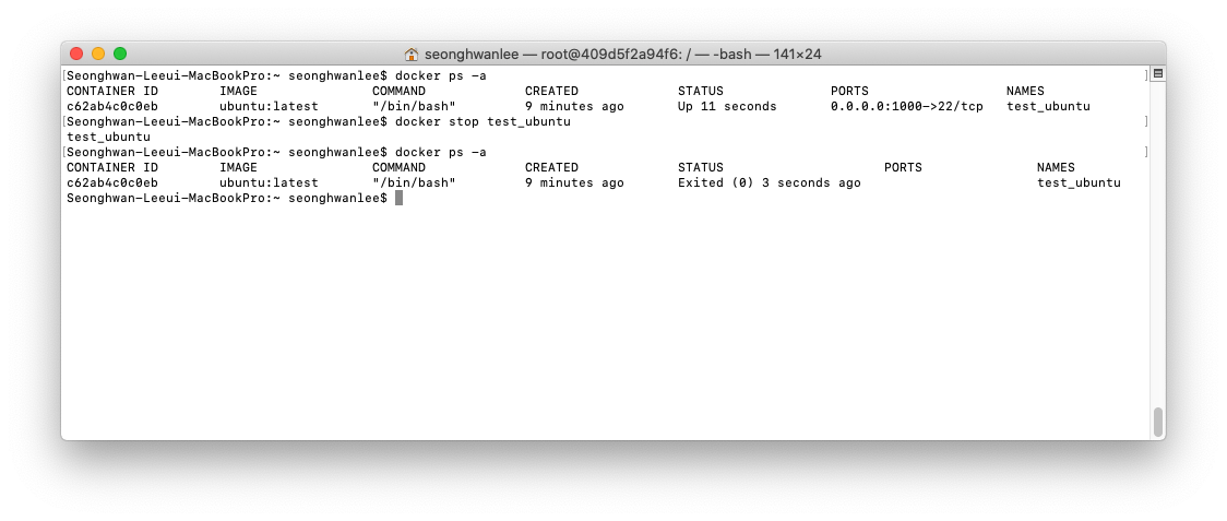 우분투 컨테이너 환경이 만들어진 것을 확인할 수 있습니다.