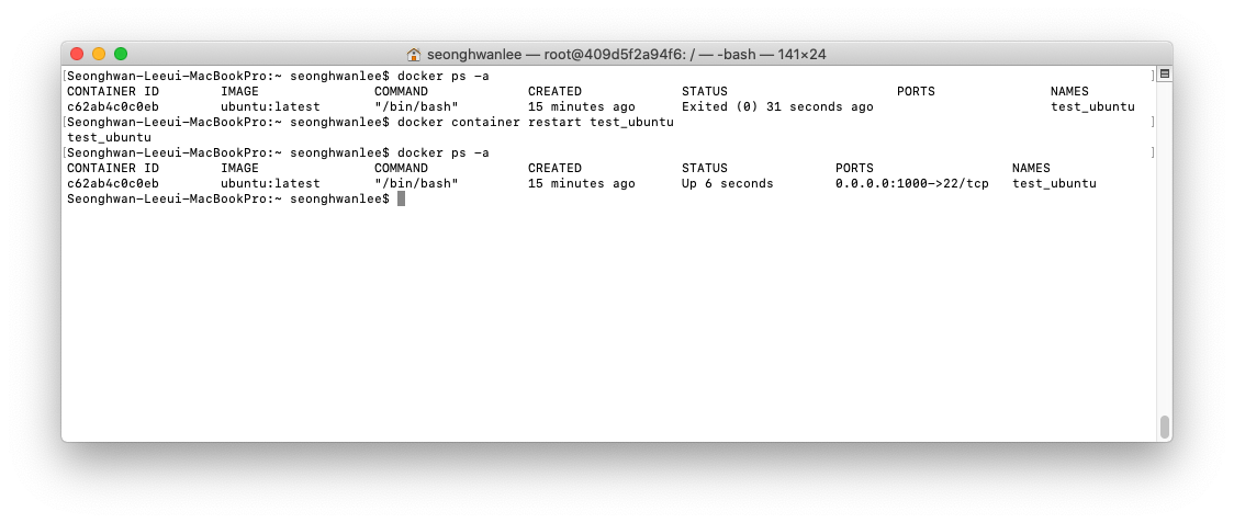 $ docker container run -it —name test_ubuntu -p 1000:22 -p 1001:8080 ubuntu:latest /bin/bash※ 2020.01.04 추가 : 0~1023 까지는 well-known port라고 하여 이미 지정된 포트 번호일 경우가 있다고 하니 잘 쓰지 않는 것이 좋다고 합니다. 이 글을 쓰는 당시, 1000번 포트로 실습하였으나 1024~49151 범위의 포트를 지정해주는 것을 권장합니다.